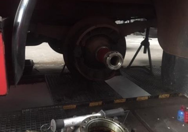 Handbremse ist feststellbar über Ratsche Druckluft betätigt und wirkt auf die Hinterräder. -