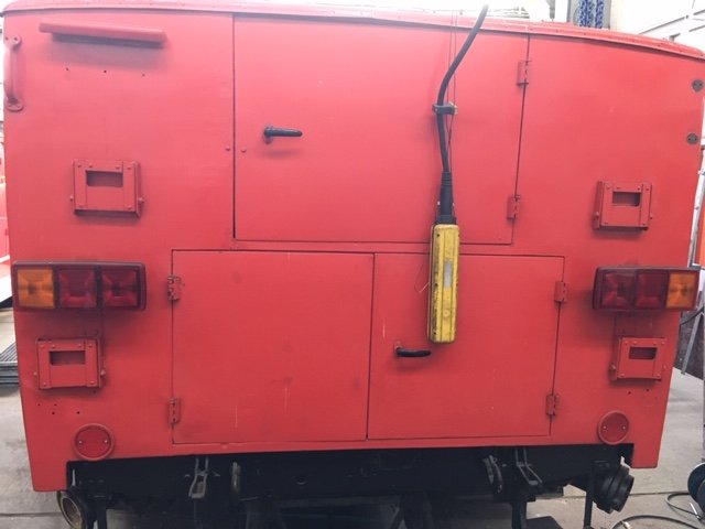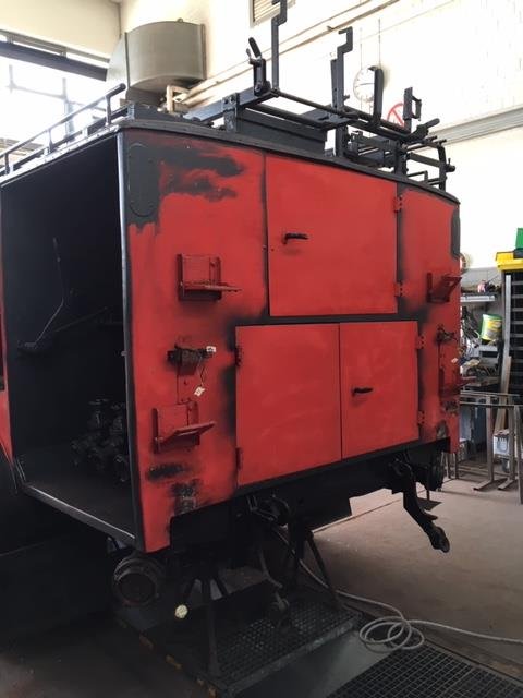 Es ist außen mit Stahlblech, bzw innen mit Sperrholz verkleidet.Die Dachspriegel sind aus Hartholz.Die Dachverkleidung aus Stabbrettern mit wasserdichtem Dachstoff / Pappe bezogen. Einstiegstüren innen mit Sperrholz verkleidet, über allen Türen sind Regenleisten. -